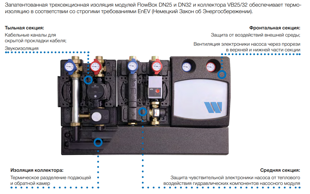 Насосный модуль PAS 25 Watts Ind с насосом Wilo RS 25/6 без подмешивания предназначен для распределения теплоносителя в системе отопления, подходит для радиаторов, конвекторов и обогрева бойлера горячего водоснабжения. Насосный модуль отличается простотой подключения и подсоединения, а конструкция модуля позволяет при необходимости поменять местами его патрубки подачи и обратки. Все соединения модуля оснащены плоскими уплотнениями, которые дополнительно защищают от протечек. Модуль имеет в своей конструкции запатентованную трехсекционную теплоизоляцию из вспененного полипропилена EPP, которая соответствует требованиям закона об энергоснабжении и обеспечивает оптимальную вентиляцию, а также защищает от перегрева электронные компоненты насоса. Модуль совместим как с трехскоростными, так и с новыми энергоэффективными насосами.