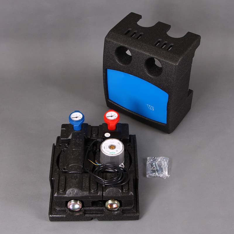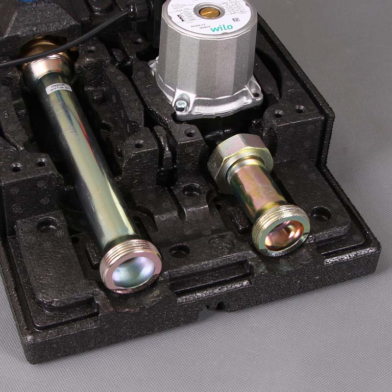 В комплект поставки насосного модуля PAS 25 Watts входят: запорные шаровые краны с термометрами на подающей и обратной линиях, интегрированный обратный клапан, который предотвращает самоциркуляцию, кронштейны для монтажа, циркуляционный насос Wilo RS 25/6 с подключенным электрическим кабелем. Компактный насосный модуль готов к монтажу – предусмотрена настенная установка. Арматура насосного модуля выполняется из латуни CW614N, патрубки – из стали EN 10305-3, уплотнения – из эластомера EPDM, плоские уплотнения – из эластомера EPDM и AFM34, седла шаровых кранов – из PTFE, кронштейны для монтажа – из оцинкованной стали. Арматура располагается в ударо- и температуростойком пластиковом коробе.