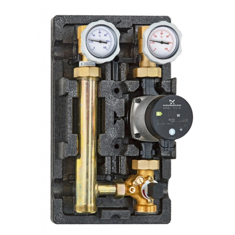Насосная группа Uni-Fitt DN25 с насосом Grundfos Hybrid 25-70 180 предназначена для подачи теплоносителя в высокотемпературные контуры системы: радиаторного отопления, теплообменник горячего водоснабжения. Применяется для создания многоконтурных систем отопления с индивидуальными насосами в отдельных контурах. Такие системы характеризуются высокой стабильностью работы, повышенными комфортностью и надёжностью. Модульная конструкция обеспечивает компактность и простоту монтажа. Монтировать насосную группу можно как отдельно, так и на распределительном коллекторе. Корпус насосной группы выполняется из латуни, блочная теплоизоляция – из вспененного полипропилена EPP.