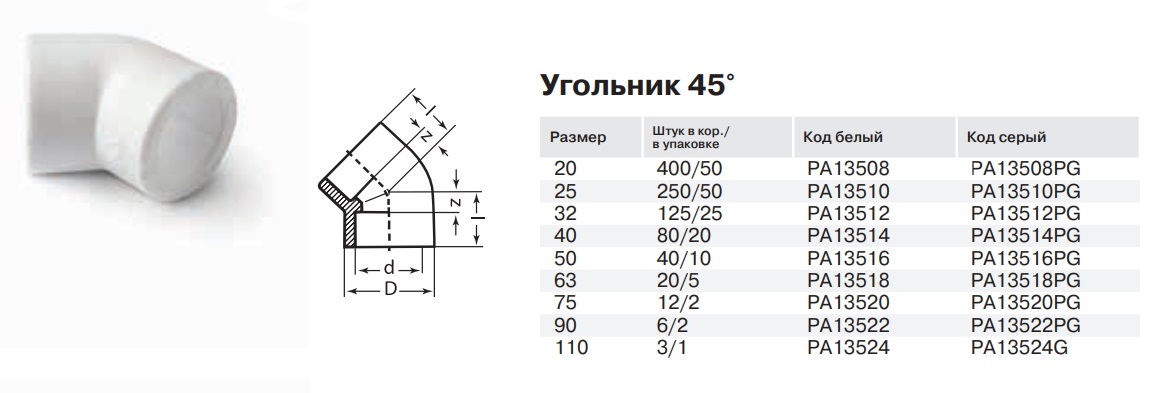 Угол ProAqua 45 градусов 50 из полипропилена представляет собой соединительный элемент для полипропиленовых трубопроводов холодного и горячего водоснабжения, а также отопления, используемый в случае необходимости изменить направление прокладки трубопровода с поворотом на 45 градусов или при обходе препятствий. Имеет внешние вставки под сварку. Максимальная рабочая температура фитинга +95 оС. Фитинг изготовлен из полипропилена PP-R 100 тип 3. Максимальное рабочее давление – 25 бар. Фитинг поставляет в белом цвете. Срок службы 50 лет. Изготовлено по ГОСТ: 32415-2013. Купить угол ProAqua 45 градусов 50 из полипропилена можно в интернет-магазине duim24.ru по самой выгодной цене с доставкой.